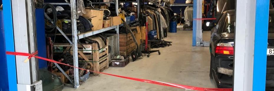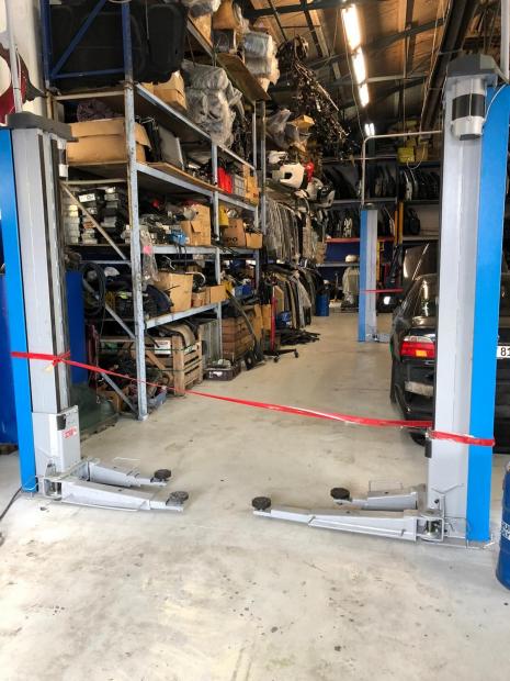 Der Blick von der Werkstatt über eine der Hebebühnen weist den Weg in eines der Teilelager.